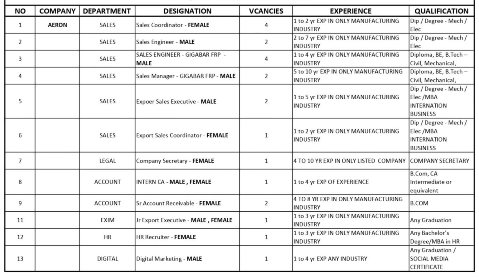 Aeron Composite Walk In Interview 2025 | Sales Engineer, Sales Coordinator & Others | Diploma / Degree | November 2025 |